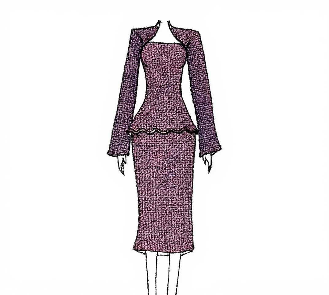 A refined two-piece designed to appear as one seamless silhouette. The fitted top features a structured high collar, soft bell sleeves, and a gentle peplum, paired with a sleek pencil skirt for a timeless finish.